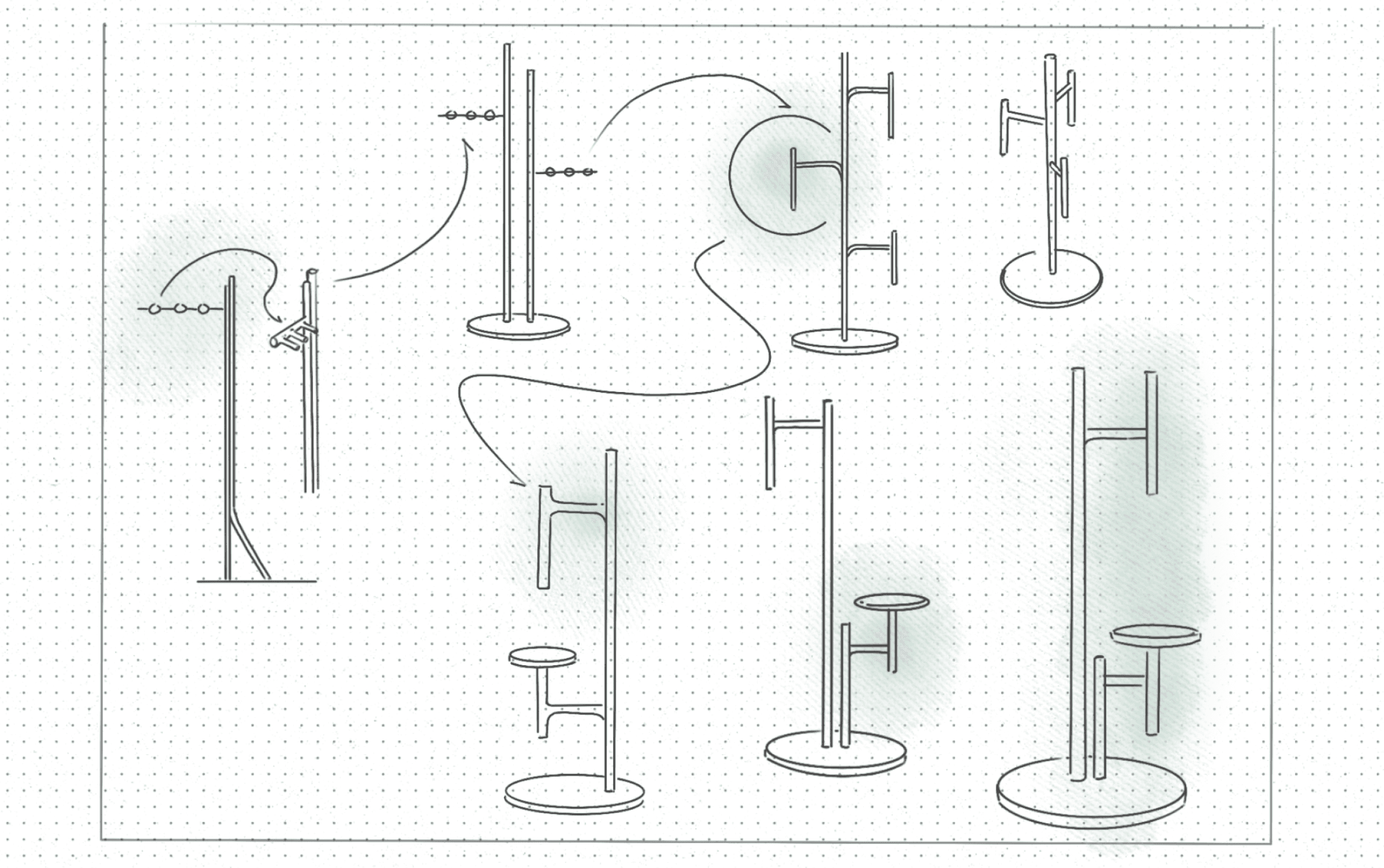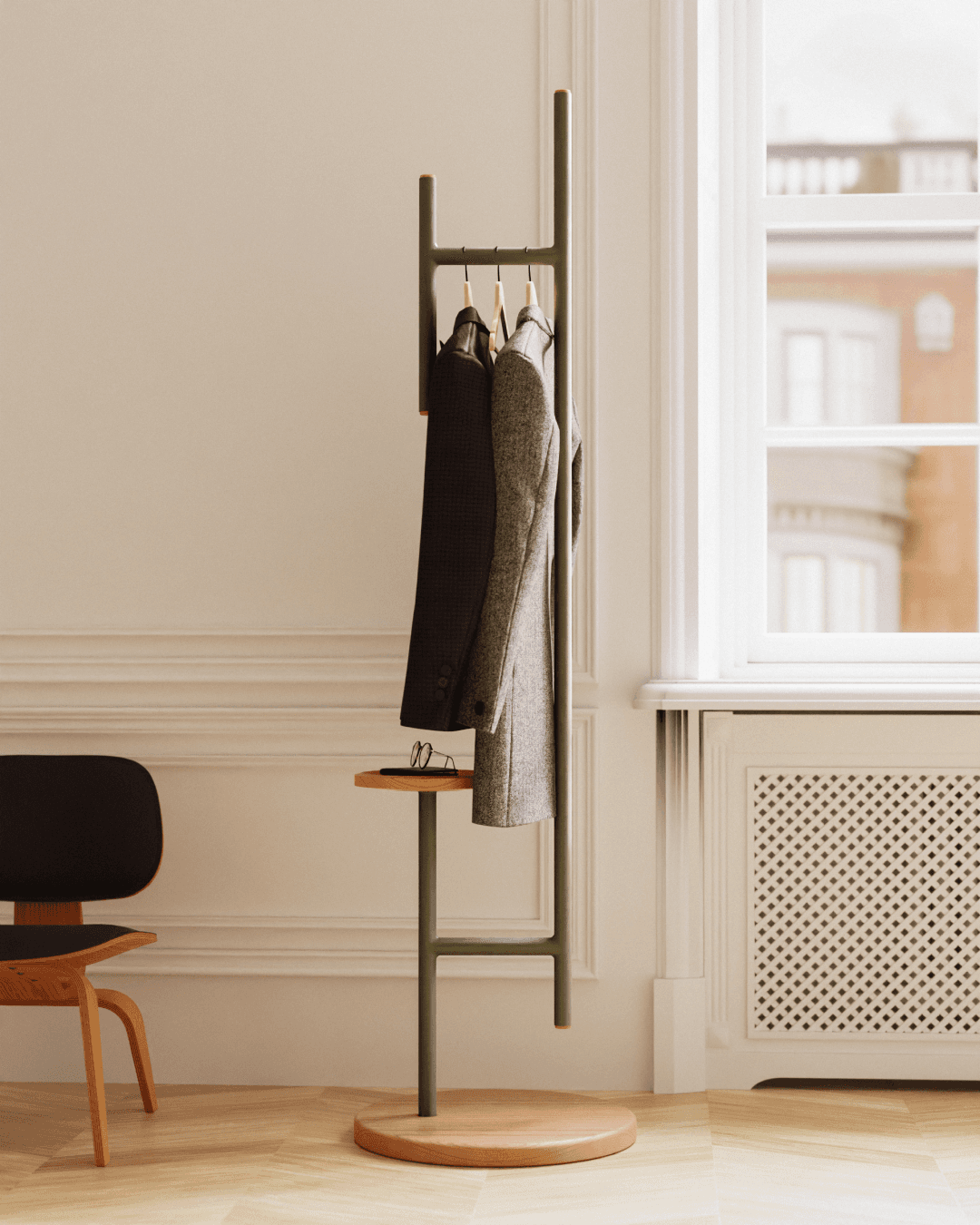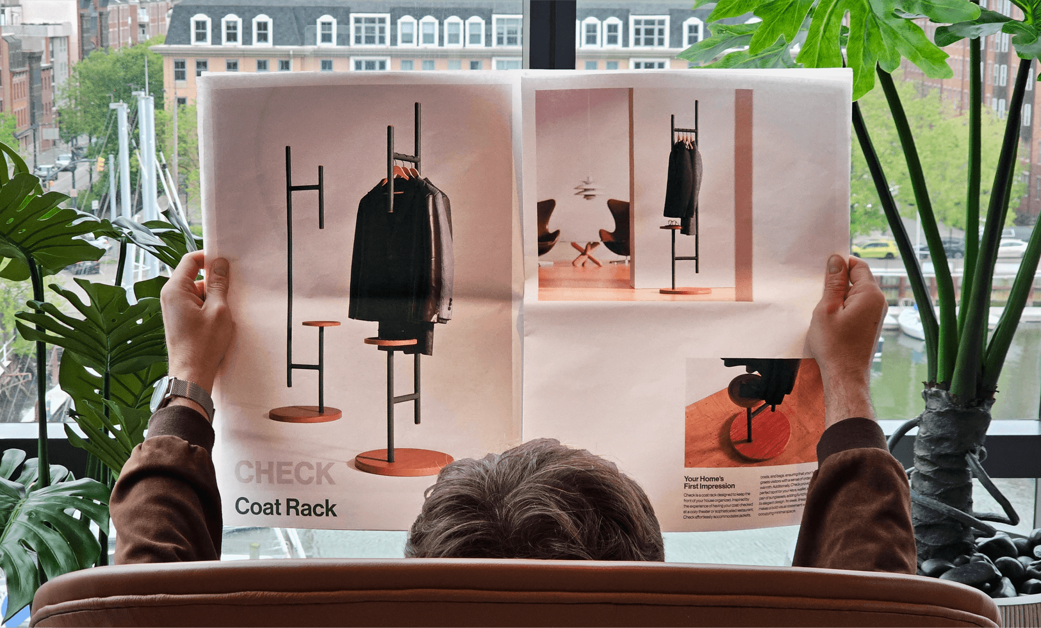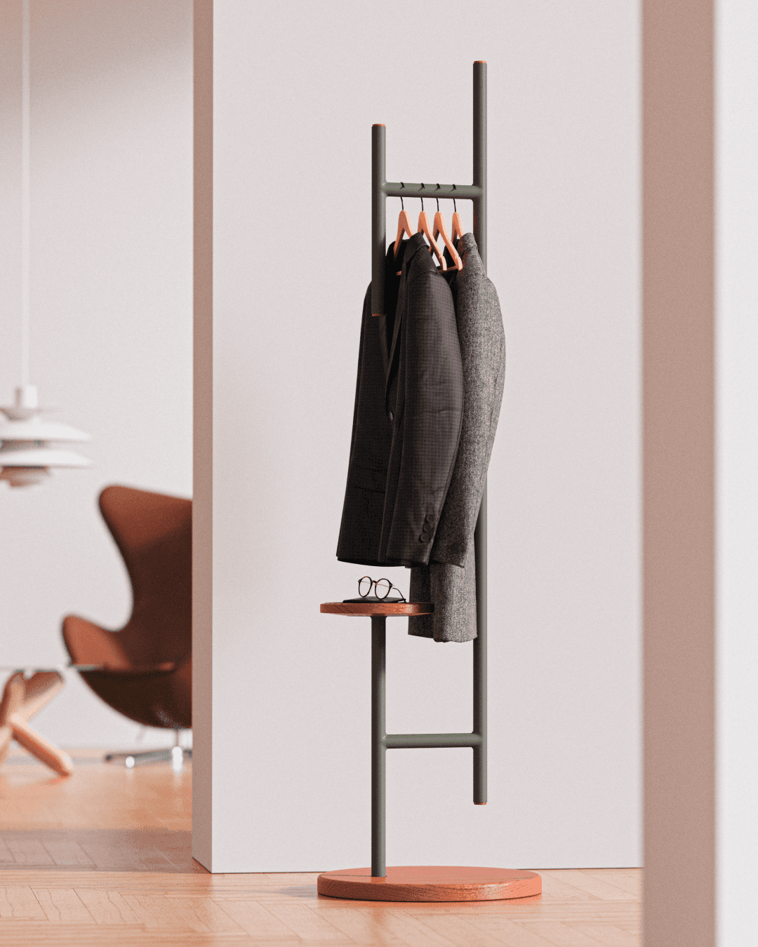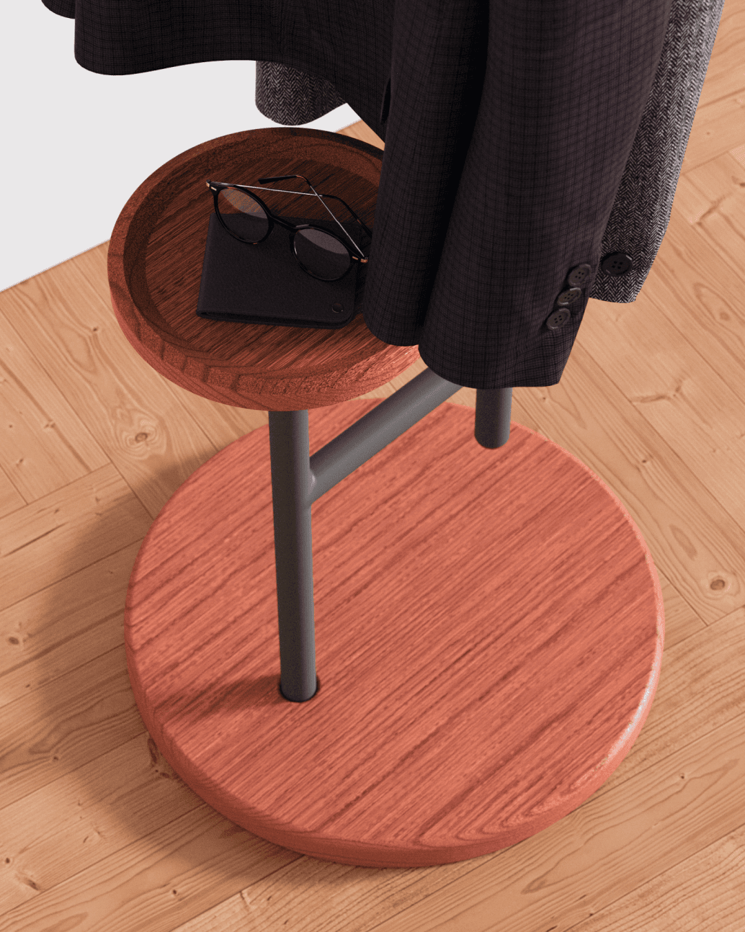 Our goal was to capture the experience of having your coat checked at a cozy theater or sophisticated restaurant. Check Coat Rack greets you with an inviting atmosphere, making you feel at home. As you hang your jacket on one of the coat hangers, you experience a sense of occasion. Check effortlessly accommodates jackets, coats, and bags while providing the perfect spot for your keys, wallet, and even a pair of sunglasses.